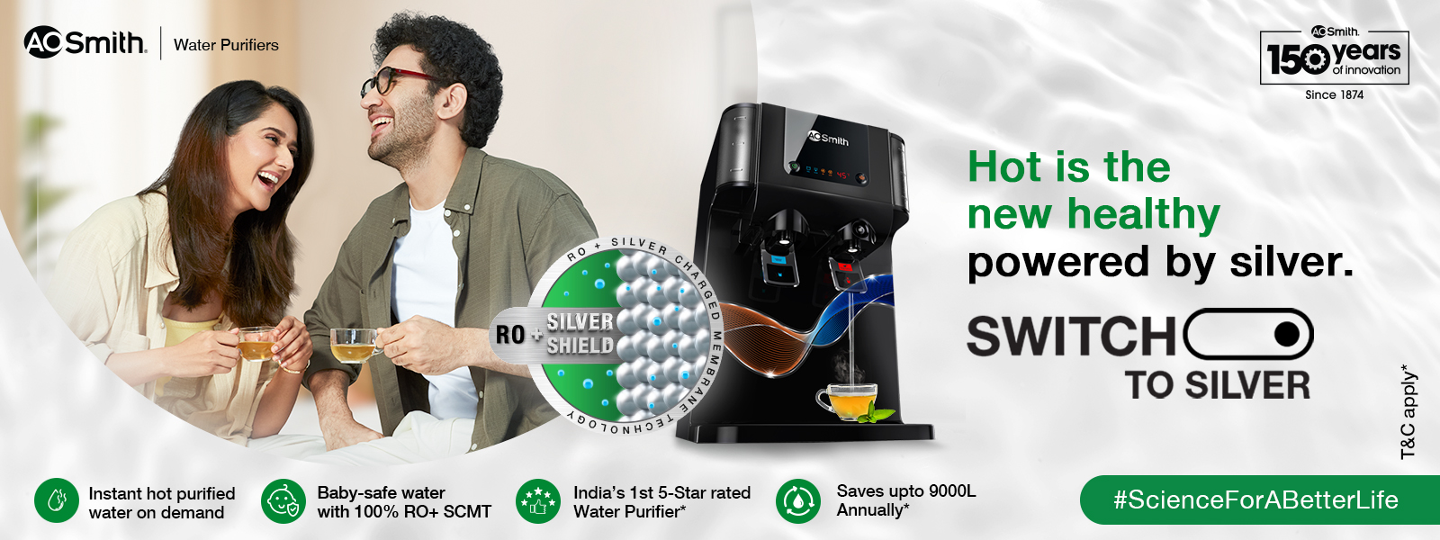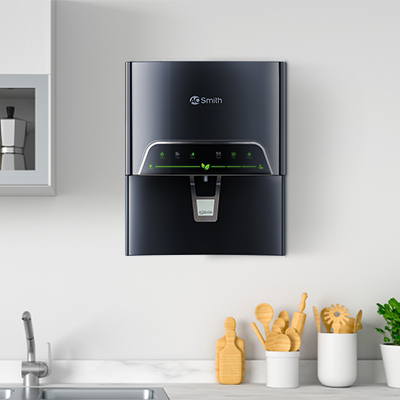 Reverse Osmosis (RO) water purifiers are generally recommended for areas where TDS levels are greater than 200. A.O. Smith’s range of wall mount and under the sink water purifiers are crafted with precision and innovation. A.O. Smith’s advanced range of electric RO water purifiers are intuitive, efficient & elevates your kitchen décor with its sleek, compact & contemporary design. In ordinary water purifiers, the water bypasses through the RO membrane, increasing the risk of contamination. Our water purifiers pass 100% through a patented side stream RO membrane filter. All of this is subsequently purified through our Silver Charged Membrane Technology (SCMT). And that’s not all; You also get to choose A.O. Smith water purifiers with the option of instant mineralized Hot Water for drinking. A.O. Smith’s ProPlanet series of water purifiers is India’s 1st 5 stars rated water purifier in terms of water savings (Certified by IAPMO).