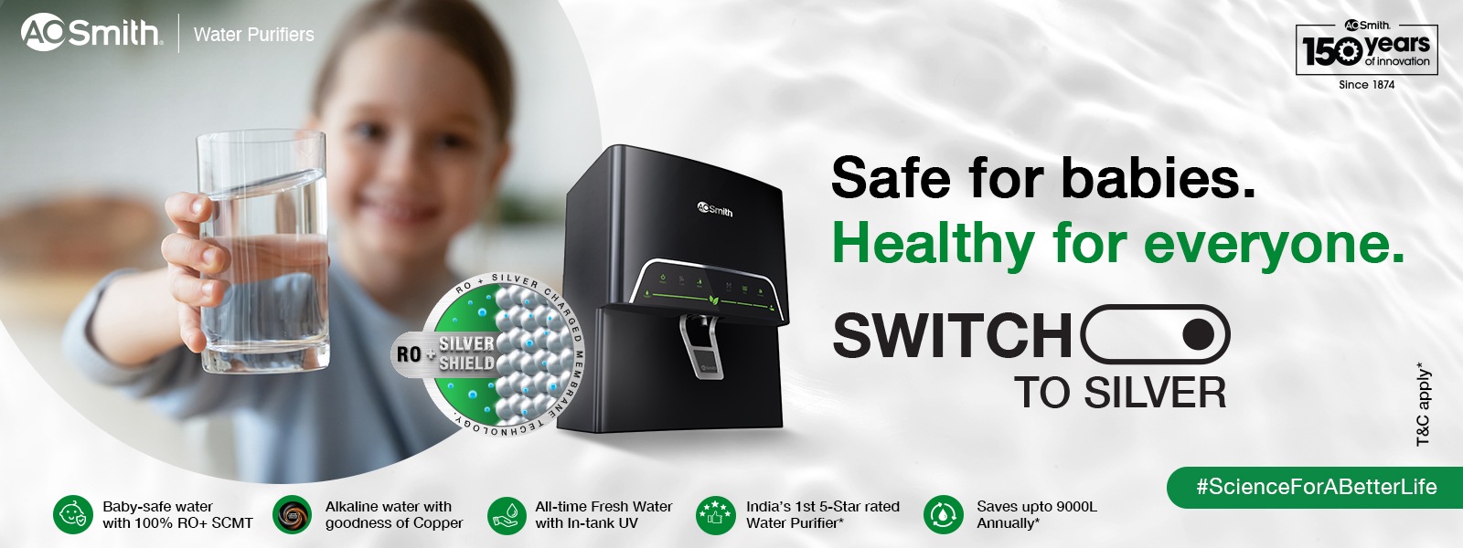 Baby Safe*, Earth Safe 5 star rated RO water purifier with 8 stage purification, hot water(45 °C & 80 °C) at the press of a button.