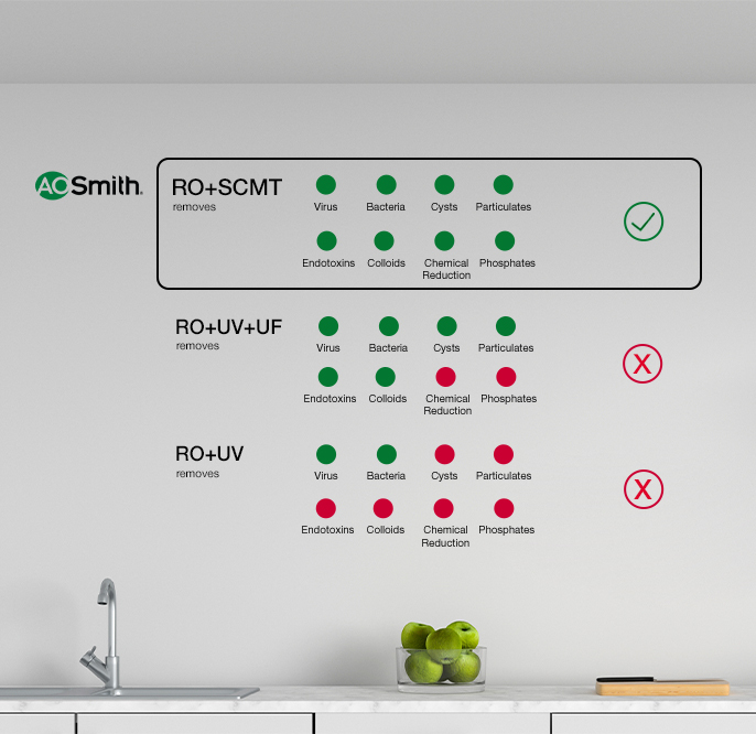 A.O. Smith X6+ provides Baby Safe with double protection of 100% RO+ SCMT. The Alkaline Min-TECH filter retains natural taste with essential minerals and provides alkaline water, so that you get water the way it was meant to be fresh, clean and good for you.