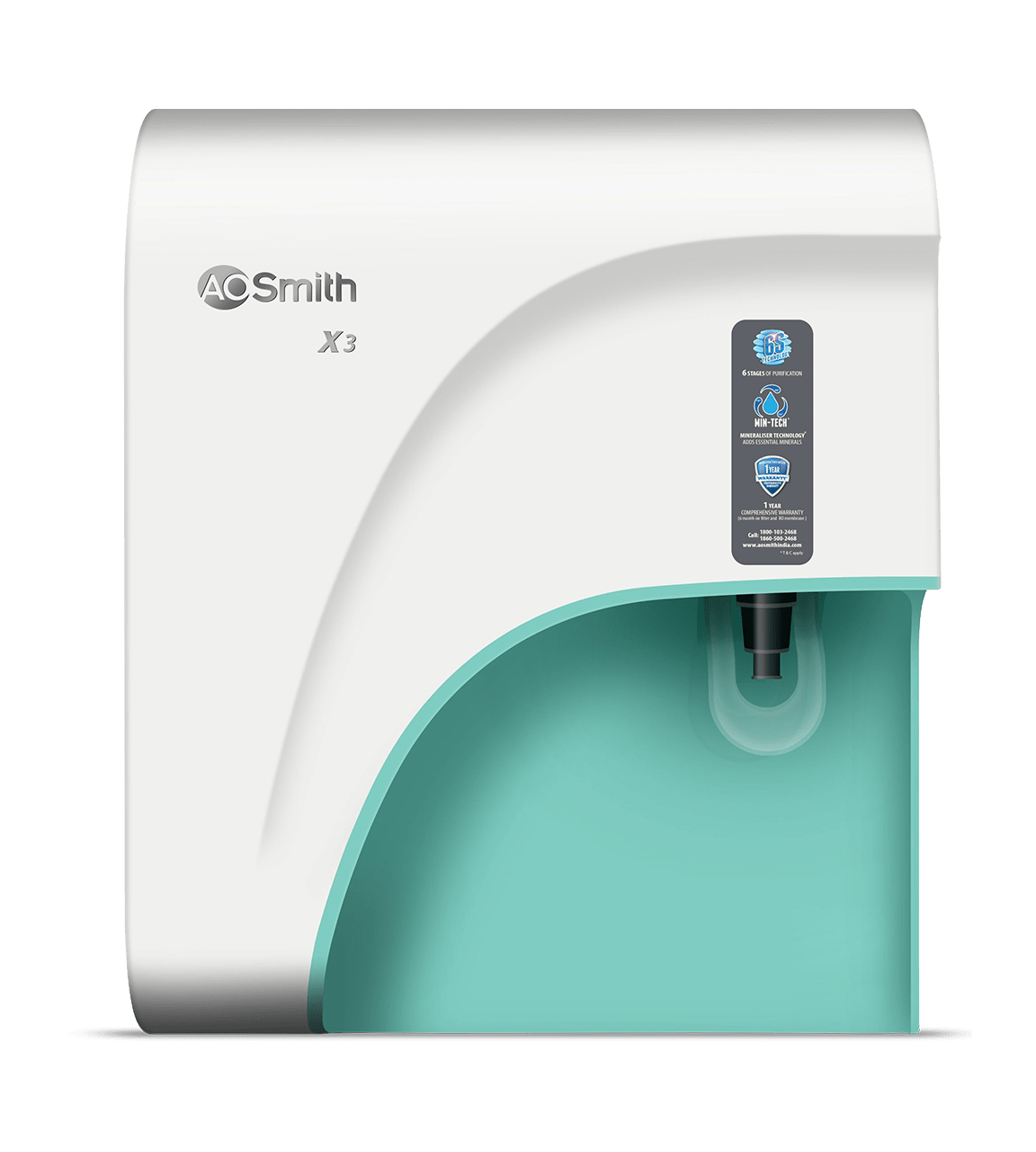 Healthy drinking water with 6-stage purification technology: Pre-filter + Sediment filter + Pre-Carbon filter + RO Membrane + SCM-TECH(Silver Activated Post Carbon) + MIN-TECH. In A.O. Smith X3, 100% of the water passes through the RO membrane, with no bypass of impurities.