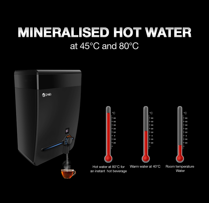 The only 5-star rated RO water purifier in India that gives you mineralized hot water, stored in a stainless-steel tank, at two temperature choices of warm (45°C) & hot (80°C)