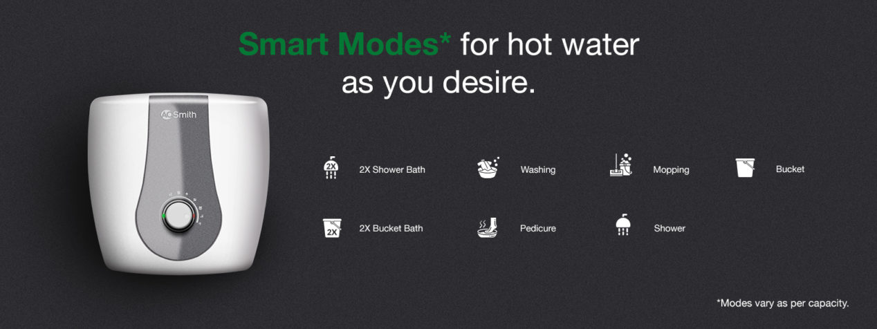 A. O. Smith has introduced Smart Water Geysers to adhere to your hot water needs in the bathroom as easy as possible. With a convenient temperature control knob, as well as the app connectivity for certain A. O. Smith products like HeatBot Wifi, switch between 7 Smart Modes that are designed for various hot water purposes: